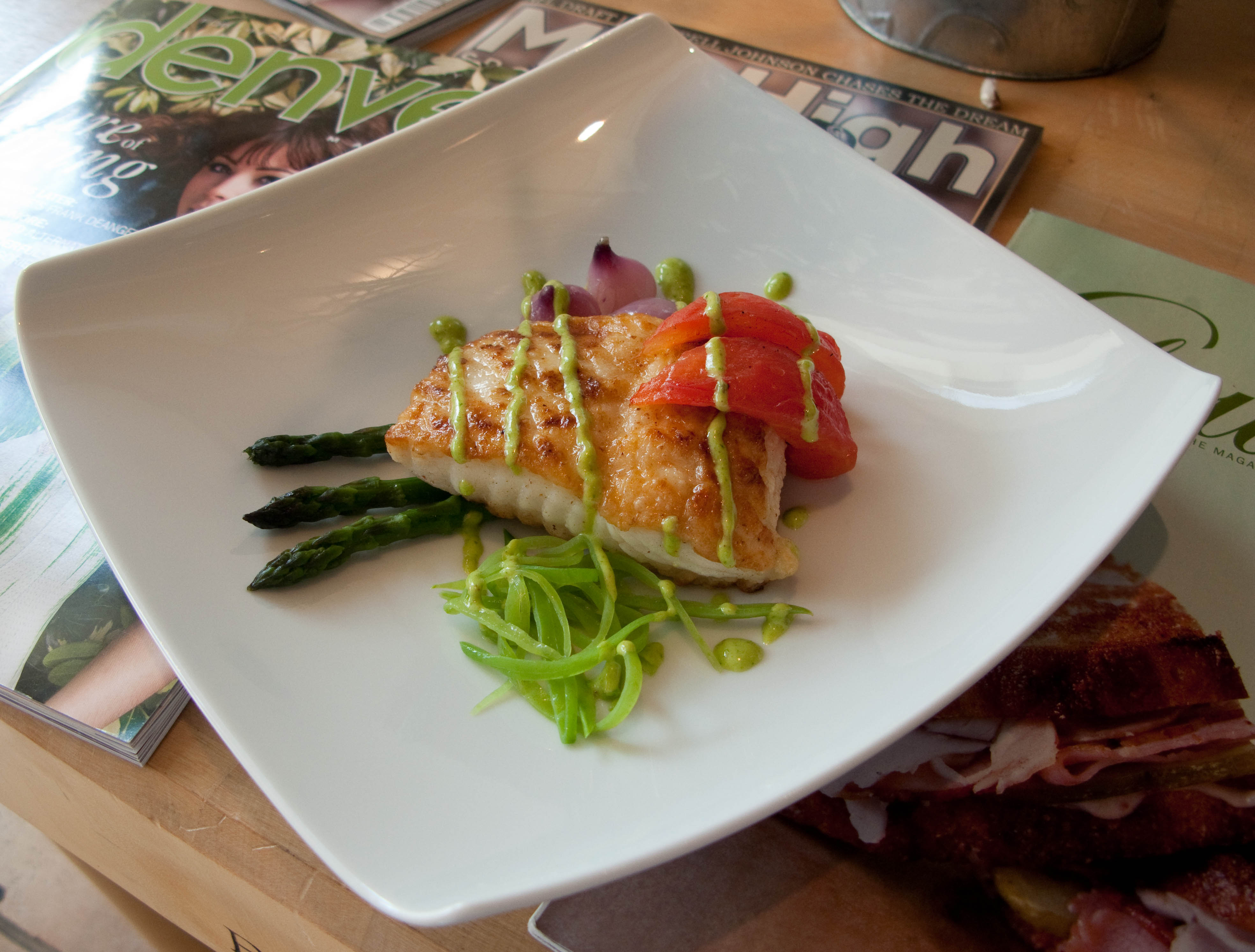His fish-inspired dish is a pan-fried halibut à la nage with spring vegetables and arugula pesto aioli.