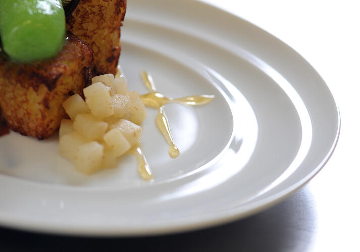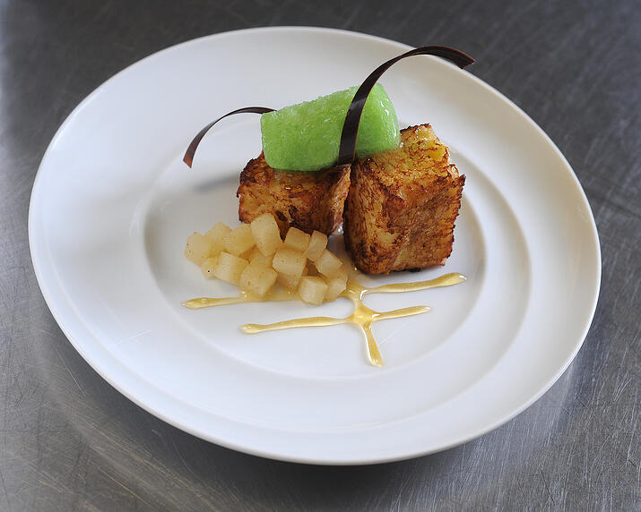 His brioche pain perdu is served with D'Anjou sorbet, pear compote, and a clear caramel sauce.